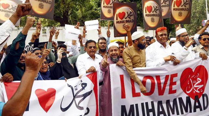 بھارتی شہر کانپور میں میلاد النبی ﷺ کے جلوس میں مسلمانوں کی جانب سے آئی لَو محمد ﷺ کے بینر…