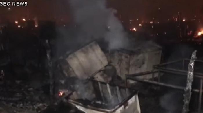 فوٹو: اسکرین گریب کراچی: گلستان جوہر میں آگ لگنے سے درجنوں جھونپڑیاں اور خانہ بدوشوں کاسامان اور کئی موٹرسائیکلیں جل…
