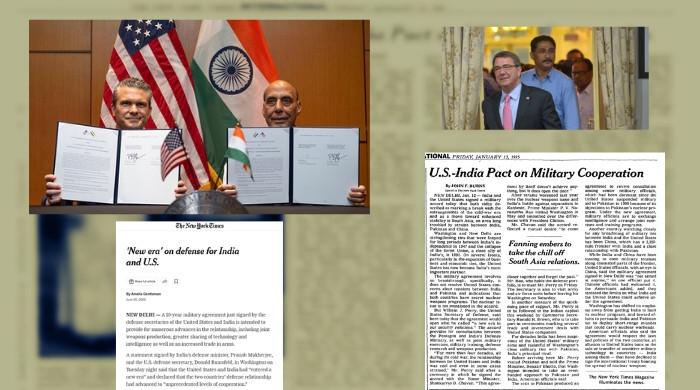 امریکی وزیر جنگ پیٹ ہیگسیتھ اور بھارتی وزیر دفاع راج ناتھ سنگھ— فوٹو: امریکی محکمہ دفاع بھارت اور امریکا نے…