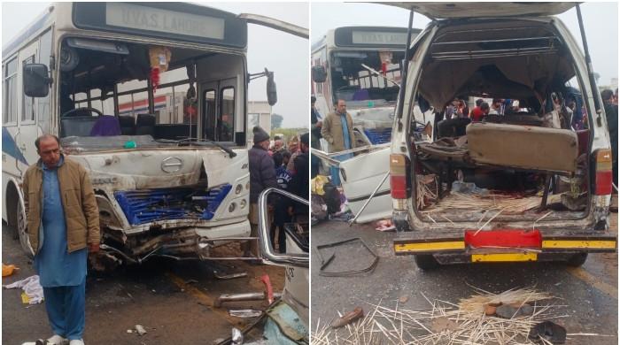 فوٹو:انٹرنیٹ جھنگ میں یونیورسٹی بس اور مسافر وین میں تصادم کے نتیجے میں 14 افراد جاں بحق ہوگئے۔ ریسکیو کے…