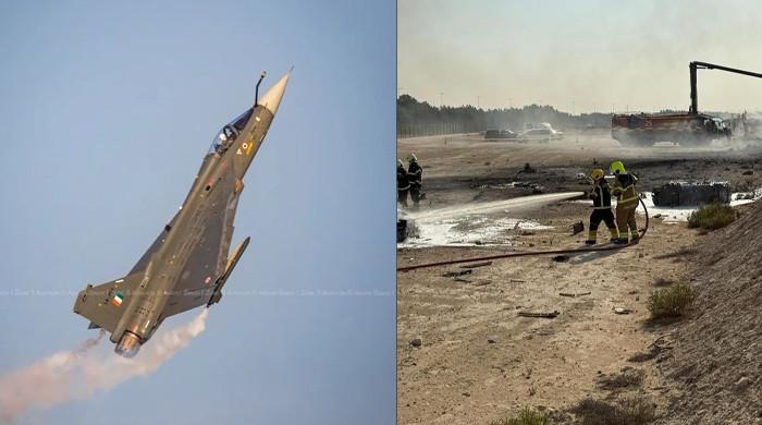فوٹو: دبئی میڈیا آفس اور ایکس دبئی کے ائیر شو کے دوران بھارت کا جنگی طیارہ تیجس گرنے کے حادثے…