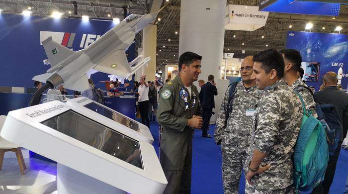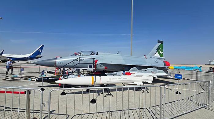 فوٹو: ایکس دبئی ائیر شو 2025 میں جے ایف17 تھنڈر بلاک تھری طیارہ خصوصی توجہ کا مرکز رہا اور دوست…