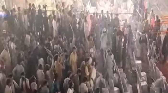 جلسے میں وزیراعلیٰ علی امین گنڈاپور کی تقریر کے دوران اسٹیج پر جوتے اور بوتلیں پھینکی گئی تھیں/ اسکرین گریب…